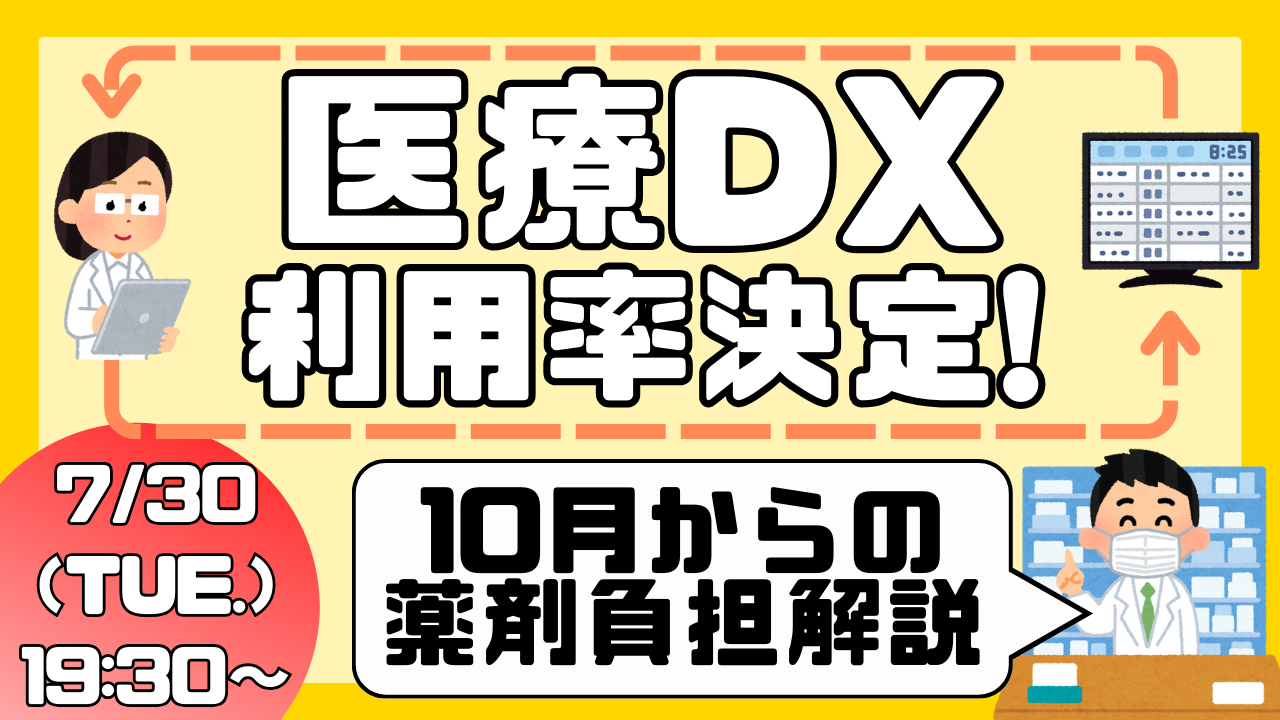 【7月30日(火)開催・見逃し配信】YouTubeライブ配信「医療DX推進体制整備加算のマイナ保険証の利用率決定!10月からの長期収載品選定療養の薬剤負担解説!!医療情報取得加算の改定【医科、調剤】」